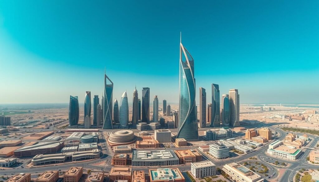 Riyadh, the capital, shows off the country’s modern side. Its skyline is filled with sleek buildings and landmarks. The Kingdom Tower stands out, showing Saudi Arabia’s love for new architecture.